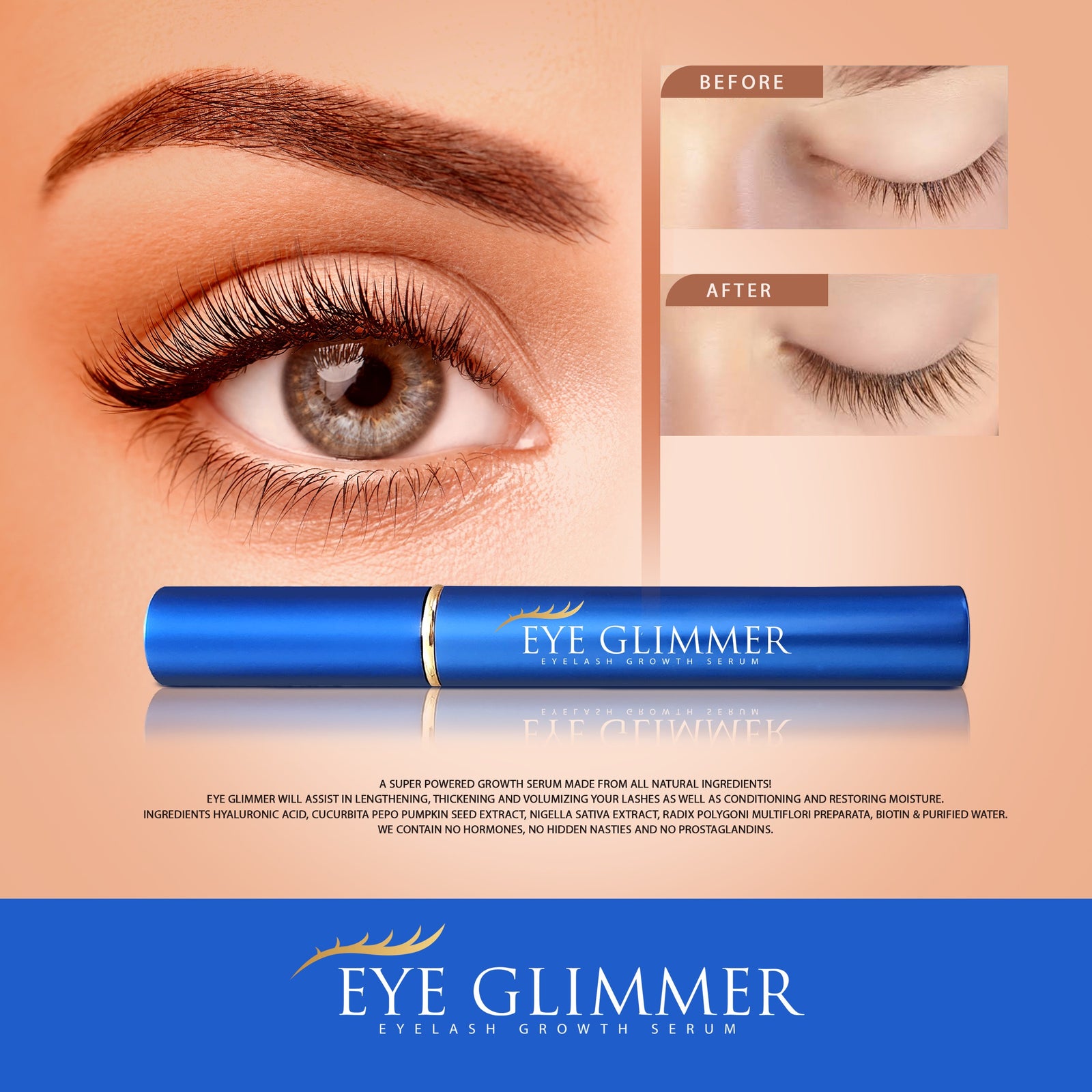 Eye Glimmers' High-Quality Eye Growth Serum is formulated with nourishing ingredients that promote lash growth and strengthen the lashes. It works by stimulating the hair follicles, encouraging longer and thicker lash growth over time.